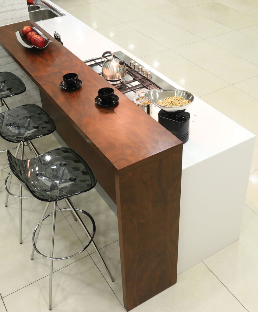 Instead of hanging cabinets, it offers the user shelves with hidden connections that provide transparency at any time. Electric touchscreen base cabinets and fully functional sensotronic drawer systems without handles provide free access to the user.