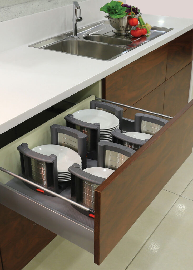 Adjustable plate holders with easy-carry function make your storage areas more organized, while the lighting on the plinth made with led strips adds a different visuality to your kitchen.