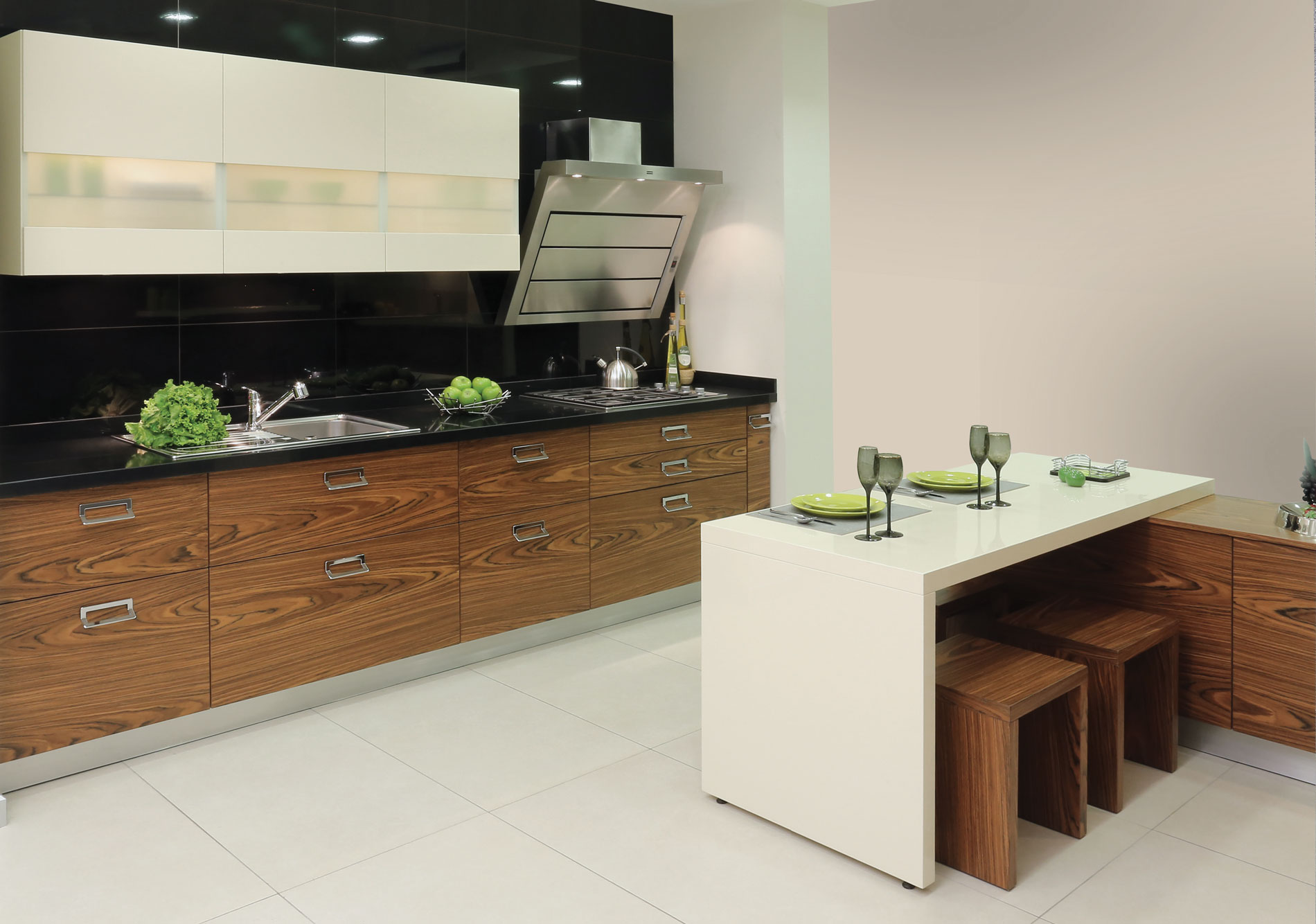 Wooden stools, L-shaped dining area, vast hanging cabinets and lacquered shelves with hidden connections provide an aesthetic presentation for your tables.