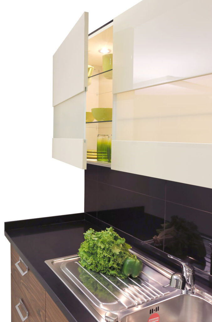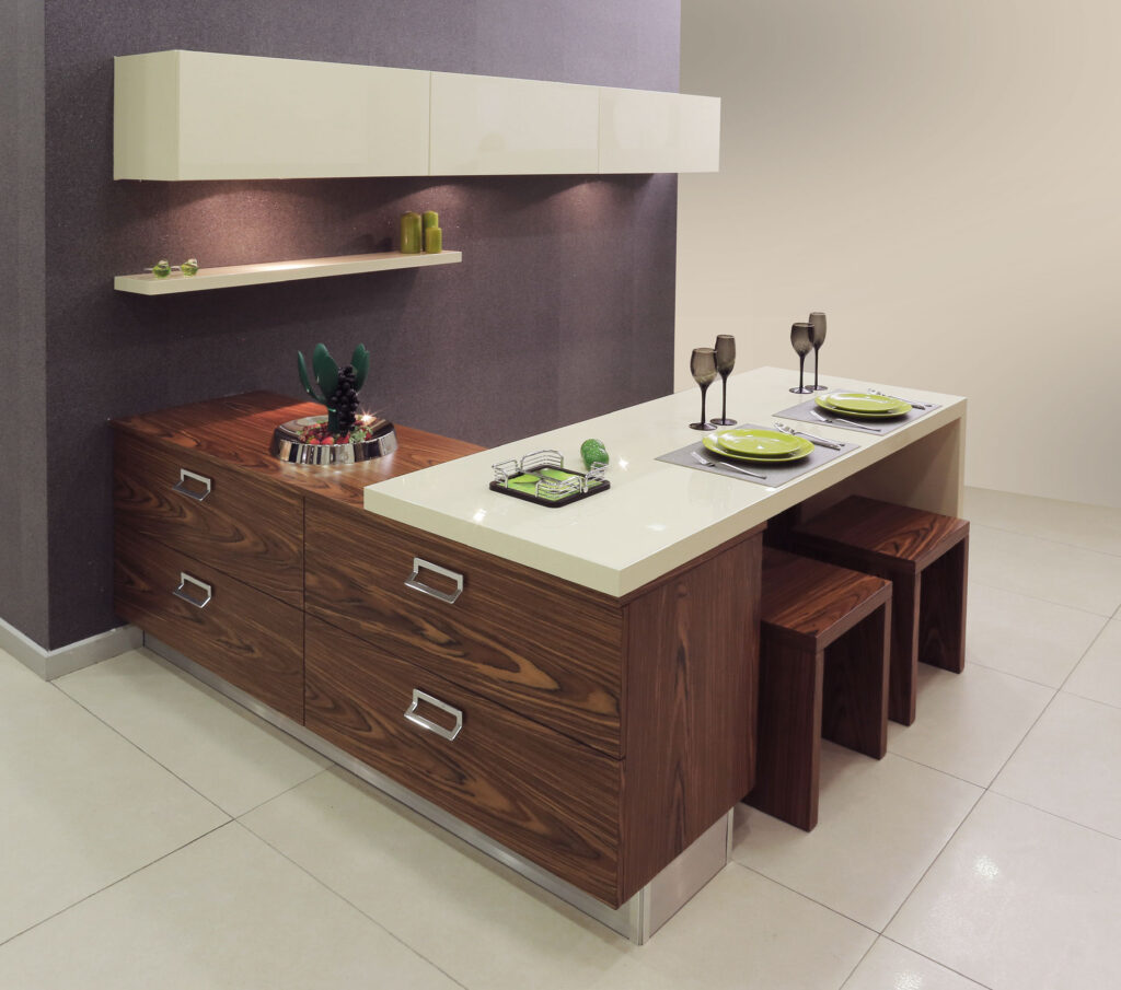 Wooden stools, L-shaped dining area, vast hanging cabinets and lacquered shelves with hidden connections provide an aesthetic presentation for your tables.
